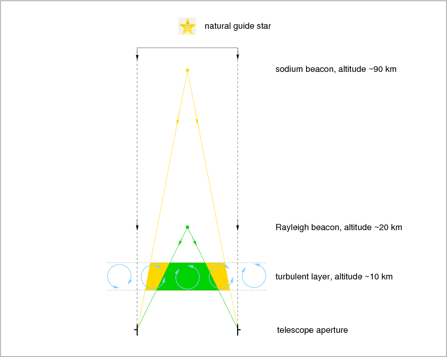 Although much more more costly and complex than Rayleigh beacons, sodium beacons have one major advantage: they do not suffer as badly from the cone effect, resulting in superior adaptive optics correction. This is shown schematically in the bottom panel of figure 66, where it can be seen that the higher altitude of the sodium beacon means that it shares much more of the turbulence experienced by light from the star than the lower-altitude Rayleigh beacon. It is important to note, however, that a sodium laser focused to around 90 km altitude also produces an out-of-focus halo of light from Rayleigh back-scattering at lower altitudes. Fortunately, this halo can be ignored by using a pulsed laser and sensing the wavefront a few microseconds after the pulse has been launched; in this way, the scattered light from lower down in the atmosphere is rejected and only light which has travelled for several microseconds up to the sodium layer and back again is detected.
