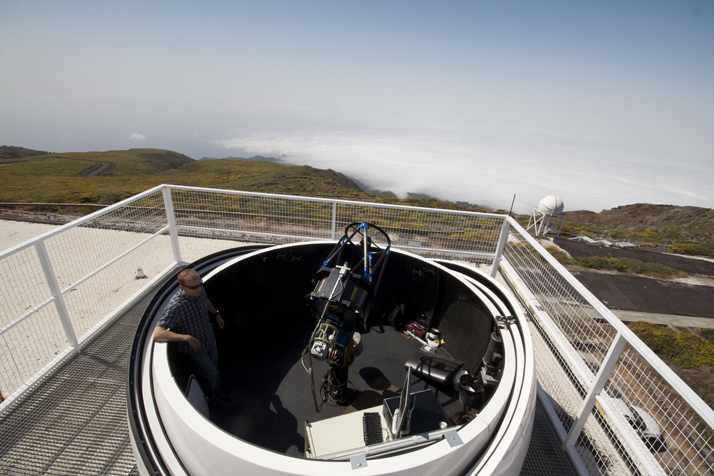 Bottom right: the open clamshell dome of pt5m, the Durham-Sheffield 0.5m robotic telescope on La Palma.